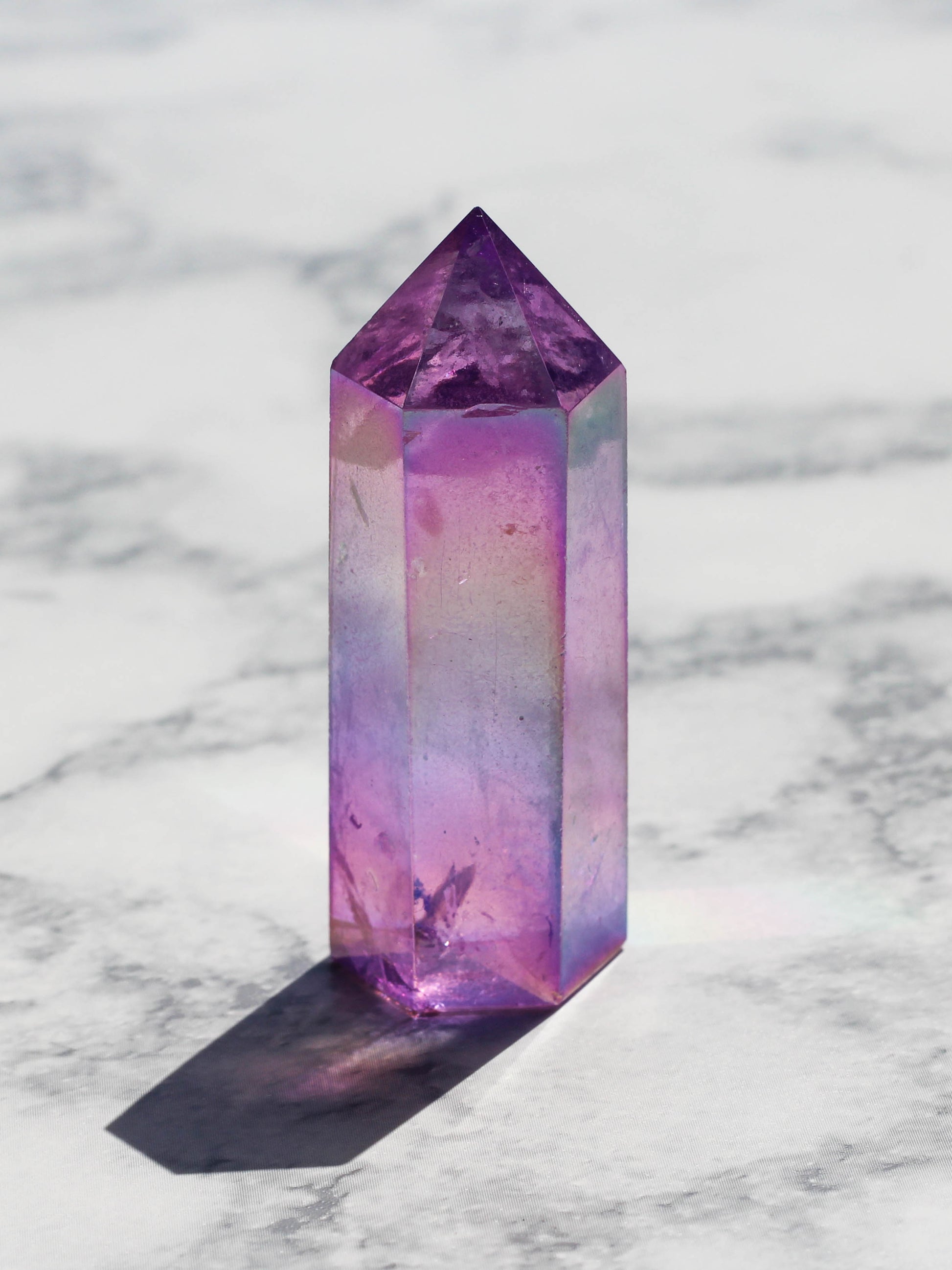 Purple Aura Quartz is created by bonding clear quartz with precious metals like platinum and silver, resulting in a vibrant purple hue with an iridescent sheen. This unique coating process not only enhances the crystal's aesthetic appeal but also amplifies its energetic properties. The metal infusion elevates the quartz's vibrational frequency, making it a powerful tool for spiritual healing and alignment.